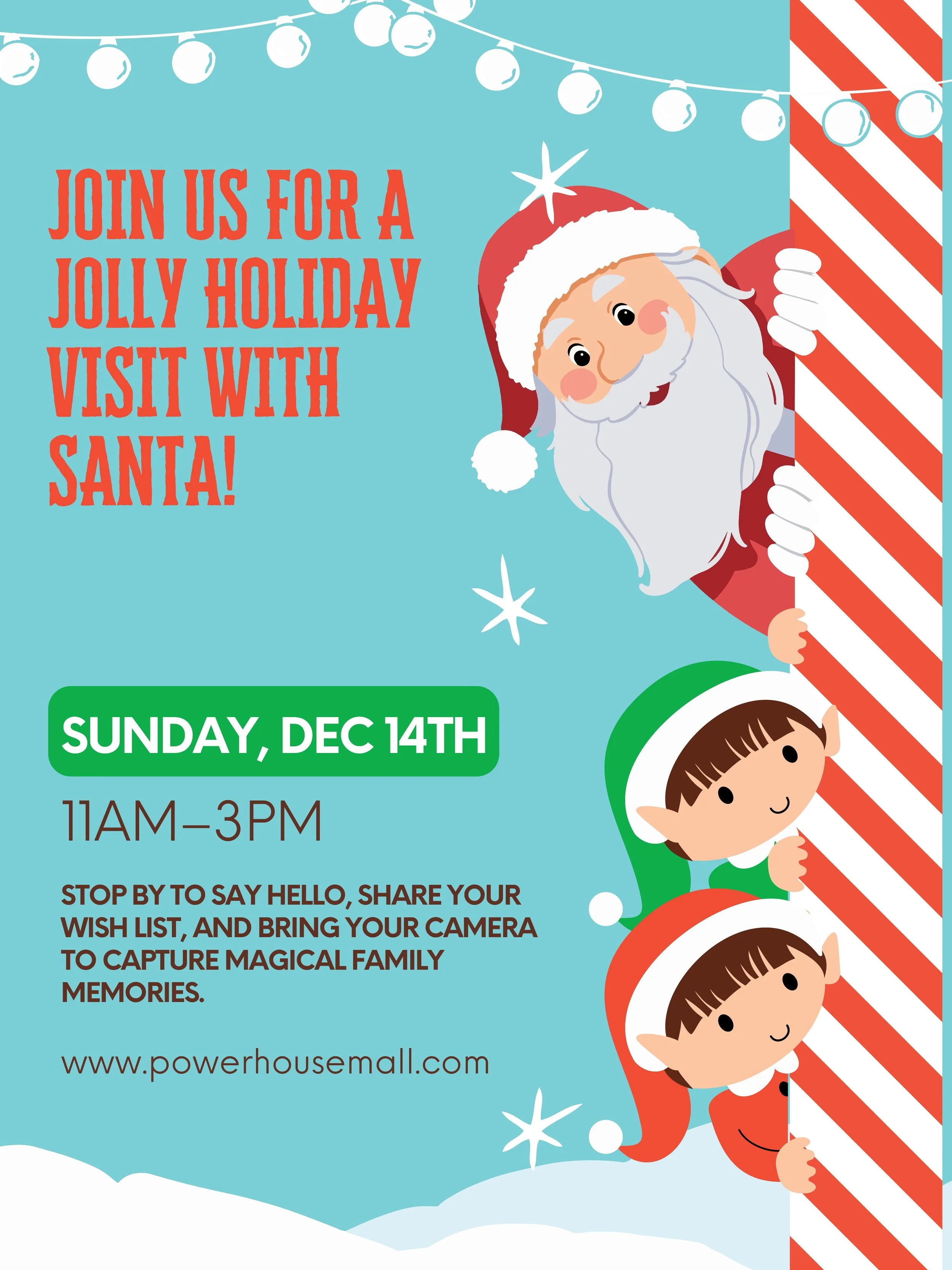 Santa is coming to the PowerHouse Mall, and we invite you to join the festive fun! Families are welcome to stop by, greet Santa, share their holiday wish lists, and enjoy the cheerful atmosphere of the season.